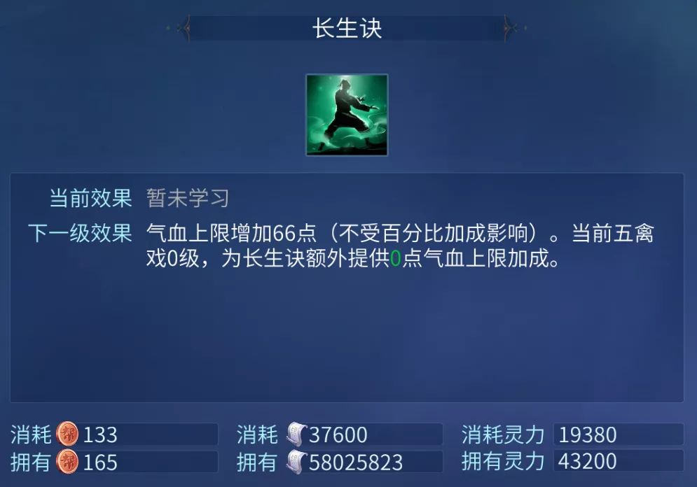 灵核达到30级后小伙伴们可以学习长生诀,长生诀可以增加气血上限,五禽戏等级越高,还能为长生诀提供额外气血上限加成。不过注意,长生诀的气血增加不受百分比加成影响,因此护手腰带无法对这个技能起效。
