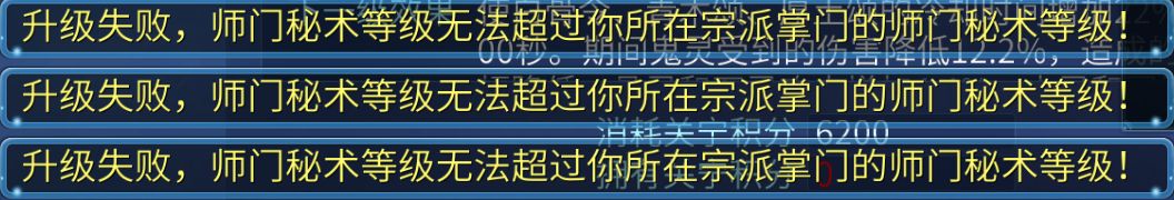 师门秘术为主动技能,等级上限为30级;习得需要消耗灵力,升级将会消耗关宁积分,在秘术等级小于26前,可以使用银两抵扣一些关宁积分。