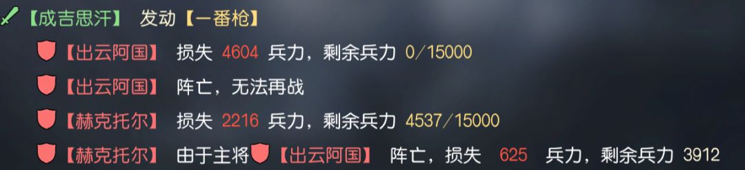 如图中触发附加效果后,成吉思汗以近半兵力,仍造成了近5000的伤害,对于单前排或缺乏减伤技能的敌人而言,一番枪的威胁力不亚于传说技能。