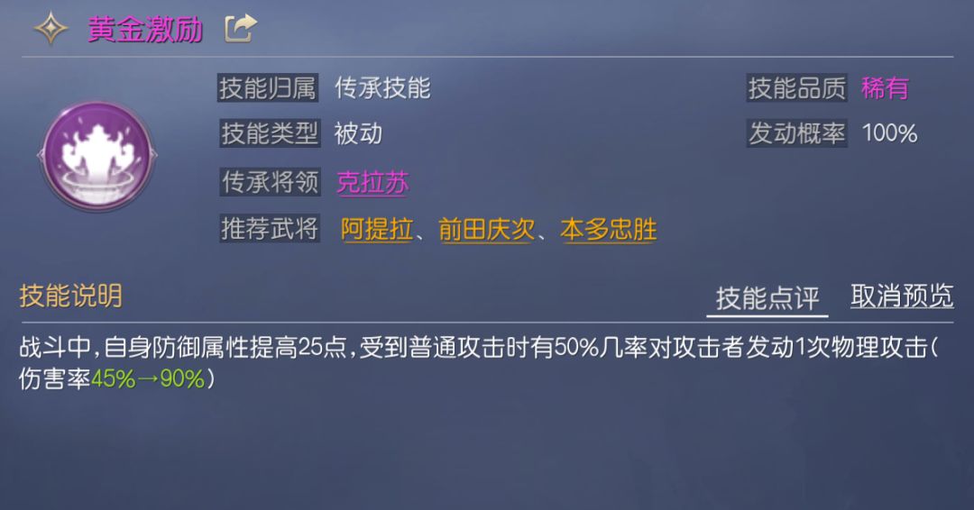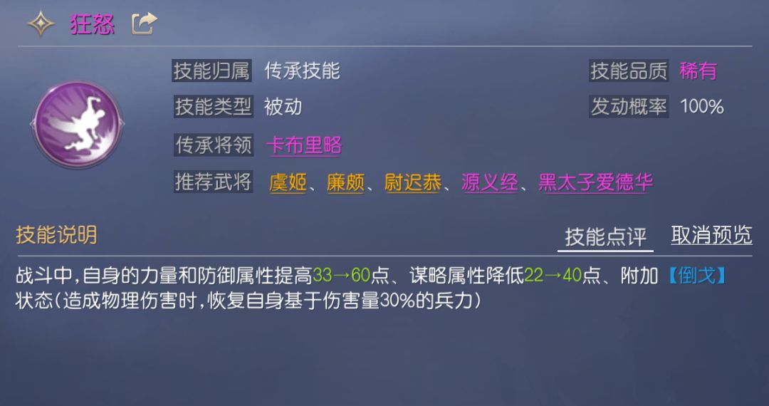 从技能解析中不难看出,大多数稀有技能相比传说技能不是单纯的缺少某个效果或是数值较低,而是各自有擅长的方向,所以稀有技能在搭配给正确的将领后,也能发挥出媲美传说技能的效果。