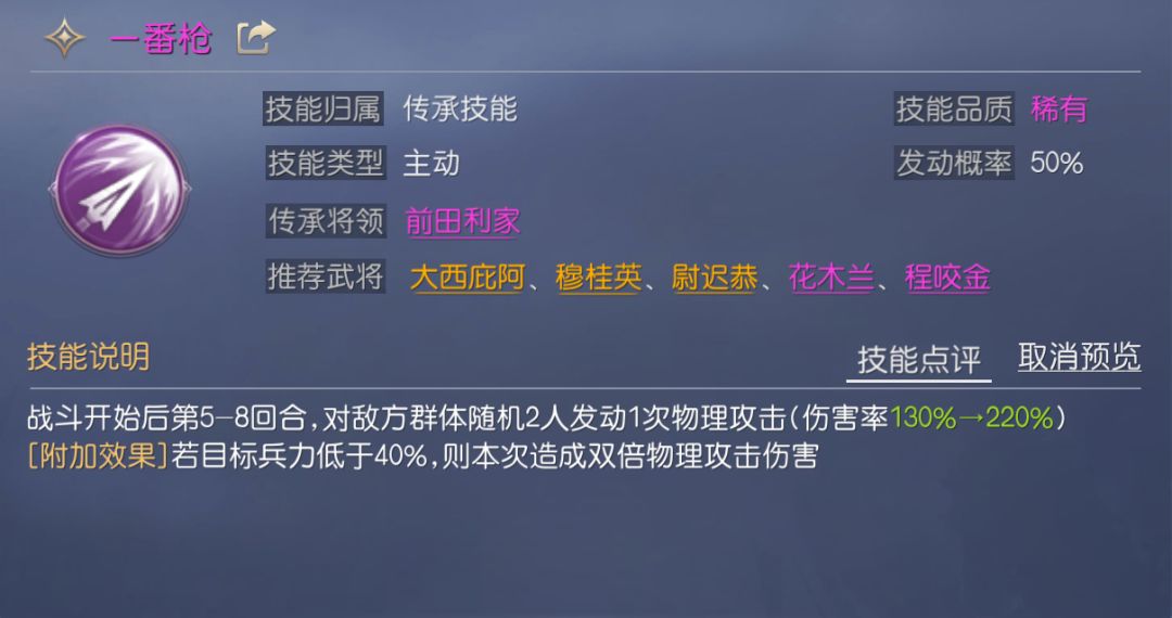 一番枪是特定发动的主动技能,只在后4回合发动,所以一番枪拥有不错的伤害率与发动率,对兵力较低的目标还可造成双倍伤害,是成吉思汗、白起等后手爆发类将领常用的技能,由于技能发动存在顺序,所以将一番枪搭配到尾速使用,大概率能触发附加效果。但需要保证将领的兵力健康,否则也无法发挥出全部伤害。