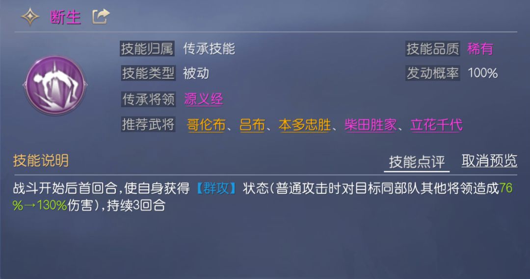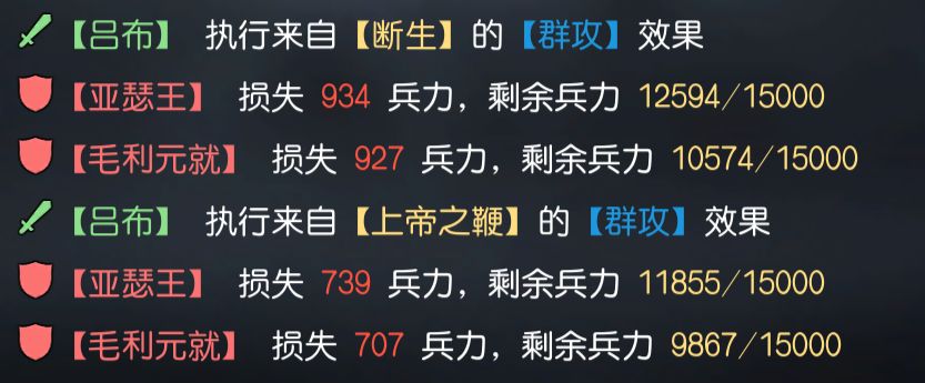 断生属于被动技能,可在前3回合为携带者提供稳定的群攻伤害,伤害率为130%,虽然持续回合较短,但稳定性与伤害率出色,非常适合主打开局爆发的菜刀队,最重要的是该群攻效果可与其他技能叠加,如图中吕布同时触发了断生与阿提拉的群攻效果。