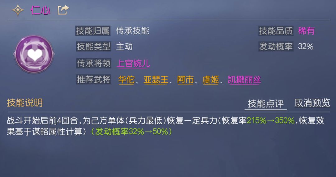 仁心是特定发动的主动技能,只可在前4回合发动,对兵力最低的将领会恢复兵力,满级后恢复率与发动率都非常优秀,没有尼罗河馈赠的群体收益和附加效果,但容错率和单体恢复率都更高,是单核阵容或分担阵容常用的治疗技能。