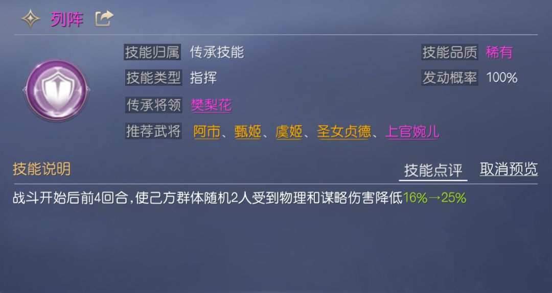 列阵属于防御型指挥技能,可在前4回合降低己方2人受到的伤害,与仰慕华风属于对立技能,虽然减伤数值没有护国宝珠、圣像庇佑优秀,但持续时间更长,主要用于防范菜刀队,大多数队伍都可使用。
