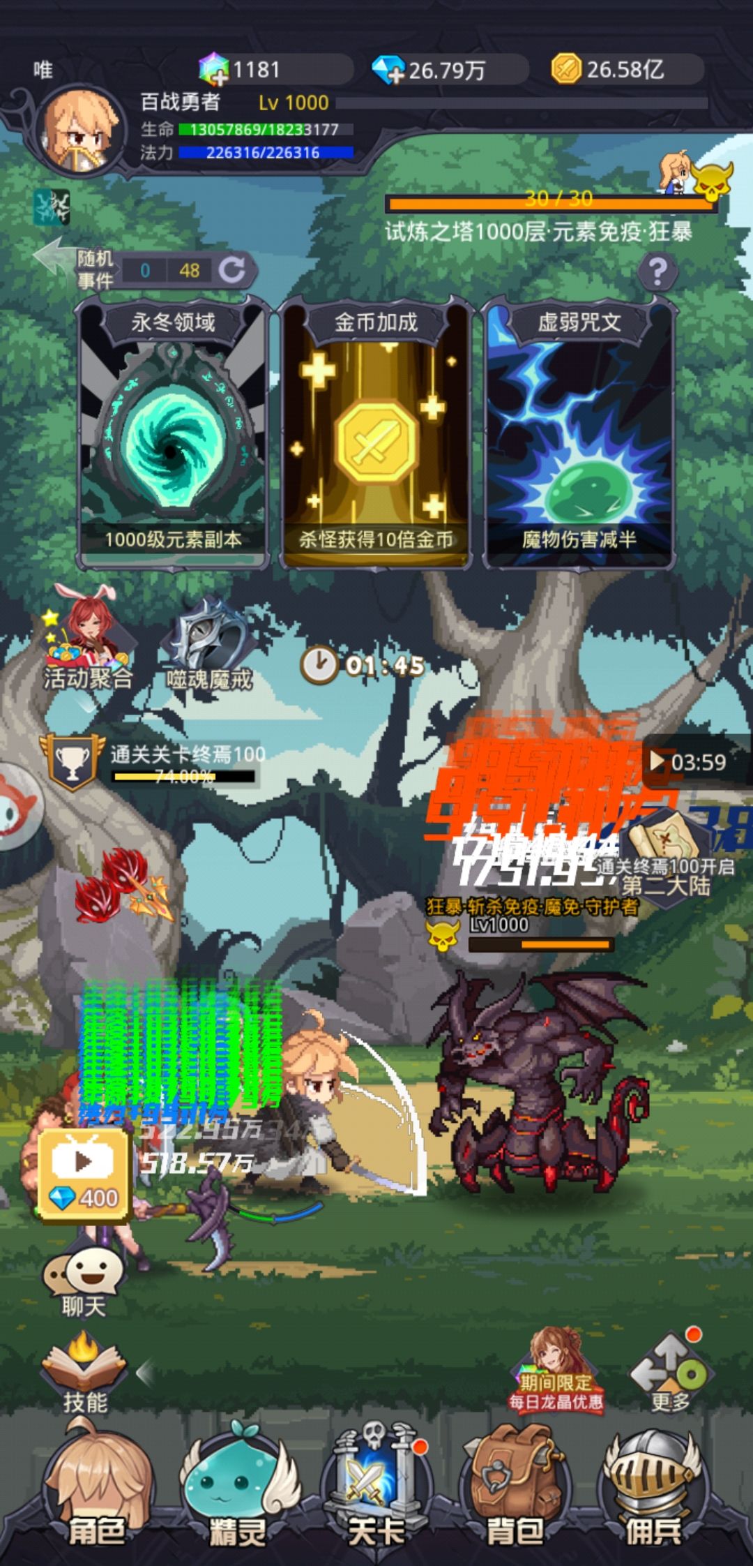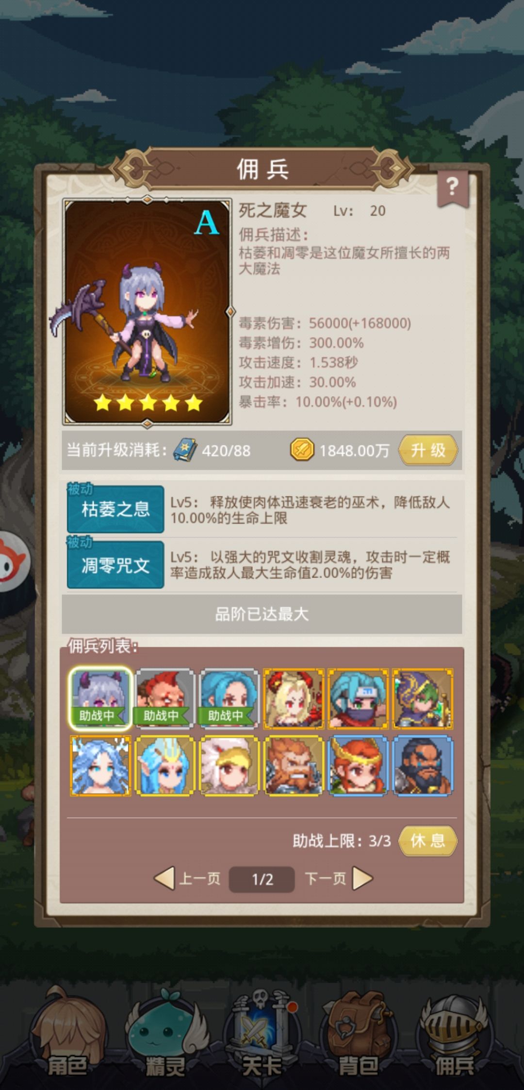说一下路线吧,致死层是最难过的一层,但是100-800层都可以靠堆血过,而940-950只能靠攻击力硬顶过去,因此你的输出至少也得到一个级别,所以血色无畏强弩这种越高越好,佣兵我用的死女 嗜血 格斗来提升输出。