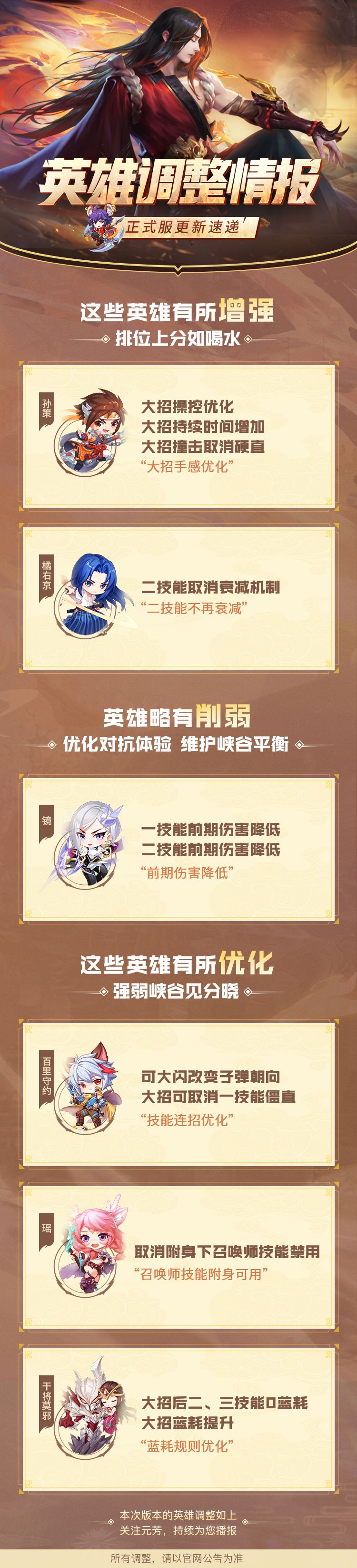 英雄调整情报丨孙策、橘右京增强,瑶优化