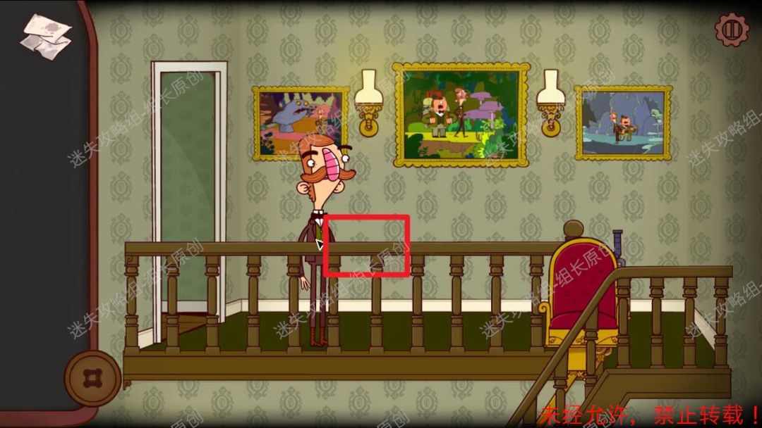 2、走廊处三幅画都是剧情内容,可以了解。栏杆红框上有一块破布,拿上。然后去红色椅子,下楼。2