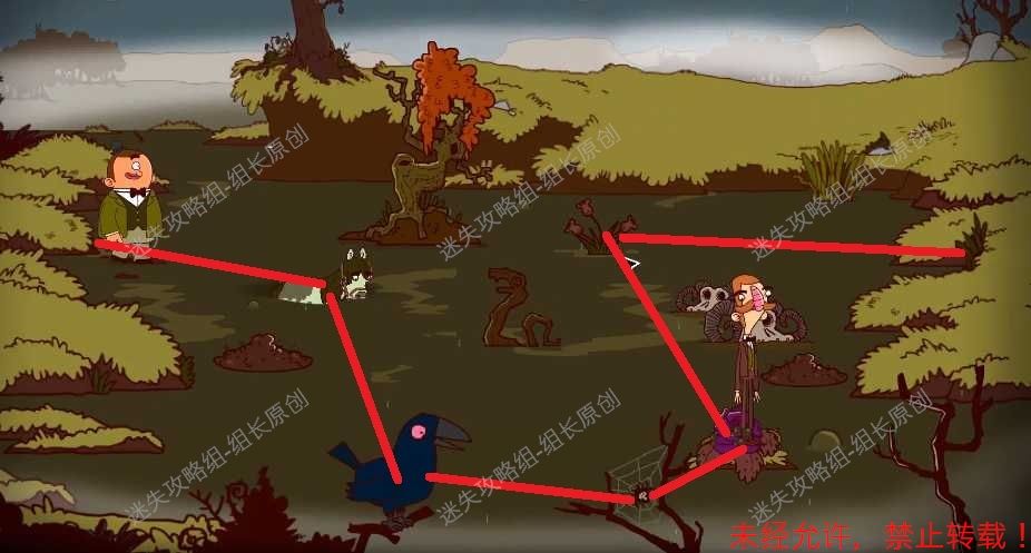 42、回到村庄,给马使用木桶,触发剧情。跟上小马一路冲去沼泽。依照下图进行点击就能到达对岸。42