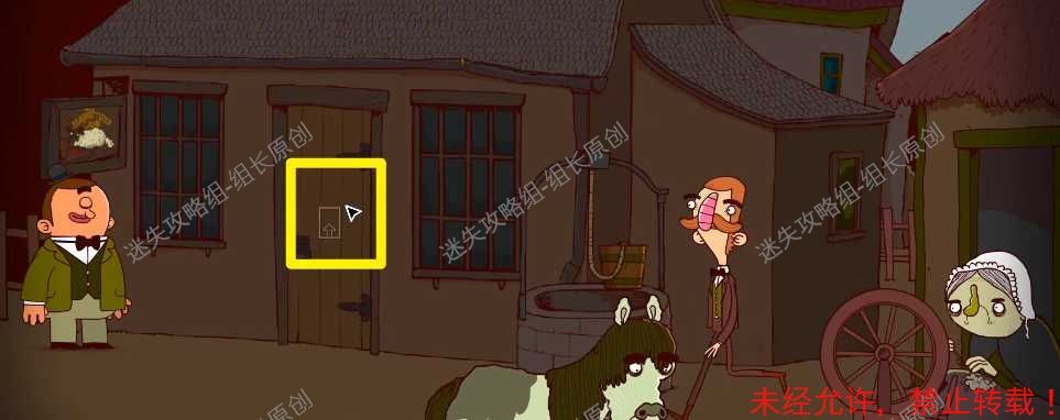 4、一直往左走可以到达庄园,点击黄框完成剧情后要证明自己是自己,去红框处使用广告拼出所需证明。4、1