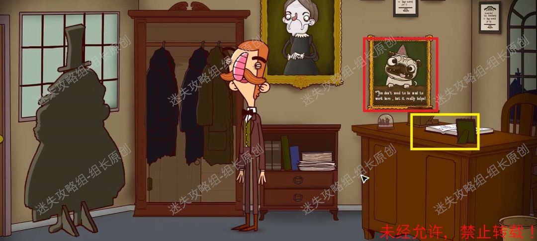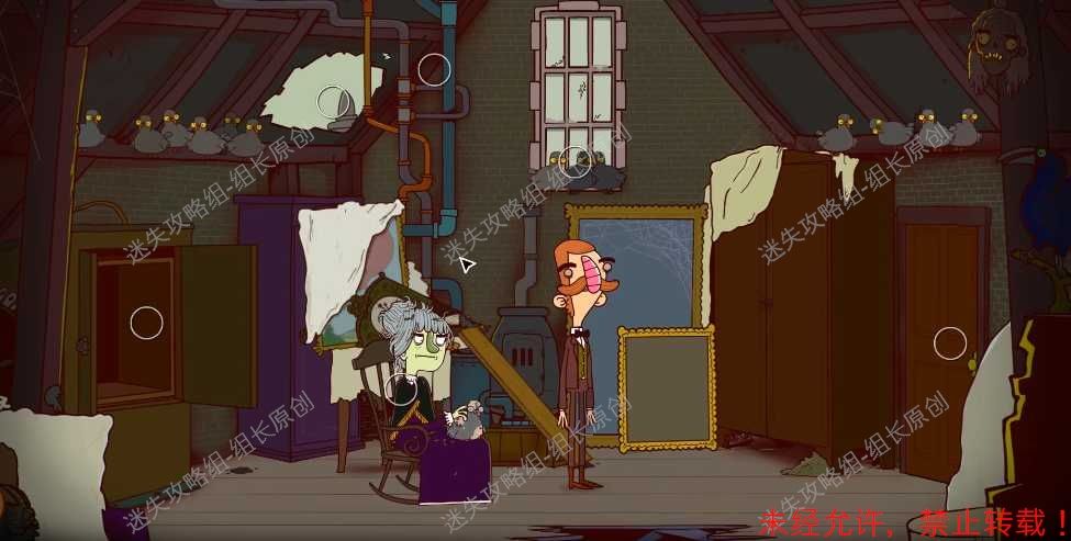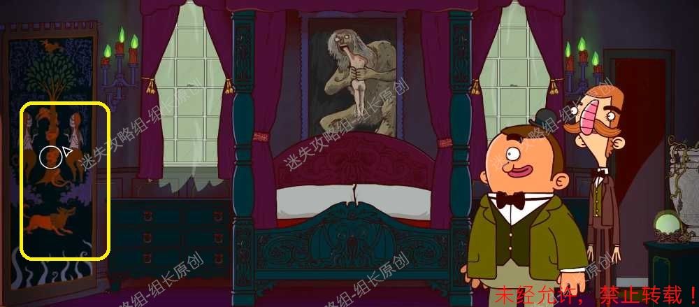 50、到达顶楼阁楼,对话触发剧情。同时右侧的门也记得触发剧情。通过食物通道前往一楼,然后去往右数第二个门,里面正在就餐,点击黄框处得到昆虫。顺便对话触发剧情。去往一楼楼梯上方的门,进入后往右走可以捡到一个手帕。最右侧有亡灵书,点击阅读并得到照片。 50、1、2