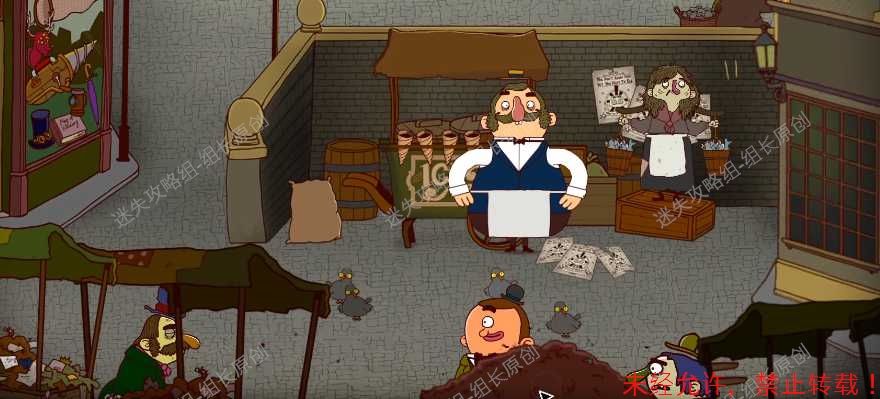 19、回到集市里,小女孩已经在左边吃冰淇淋,去点击右侧卖鱼的女人让她摔倒,触发剧情,等小女孩再次吃冰淇淋的时候,点击小女孩头上的蛋筒可以获得。之后前往左侧。