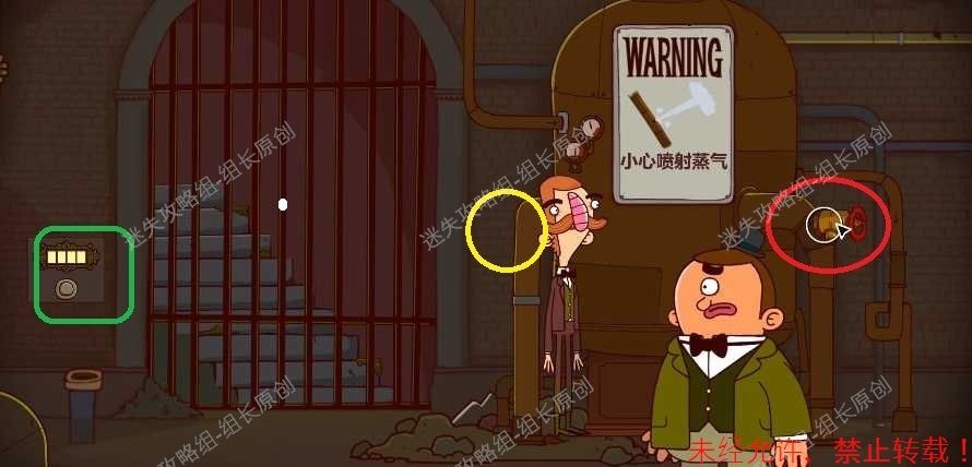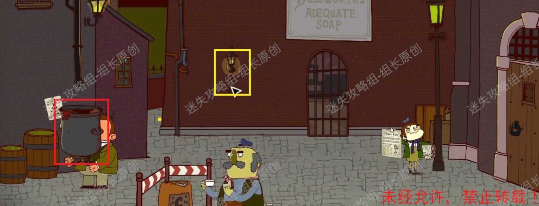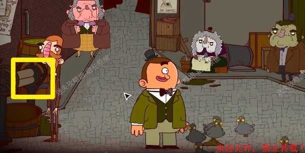 9、先与中间的管道工人交谈得到剧情。然后控制助手将红框处的铁锅抬起放到黄框处,变成一个钟。之后往左走前往街市。9