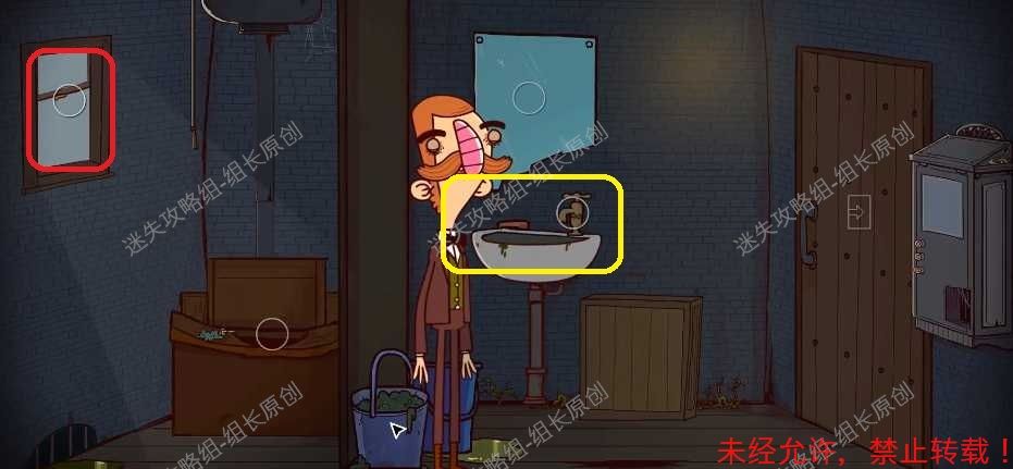 37、进到酒馆厕所里,寻找线索。红框处先关窗,然后黄框处使用水龙头,就能看到镜子上的信息触发剧情。之后回到酒馆里,拿上黄框处的桶子,同时跟黄头发赏金猎人对话,他会让我们摸他的万能钥匙,对他的钥匙使用奶酪,得到钥匙翻模。37、1