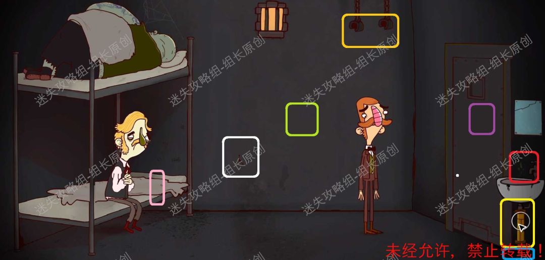 🍀第二章非法拘禁🍀8、剧情完成后身处监狱。首先黄框处得到一截管道。之后红框处放大后可以得到牙刷和玻璃碎片。黄框下面有一团不知名绿色物体,也拿上。紫框处点击敲门后可以得到一盘肉汁。粉框处得到一个毛毯。之后与下铺的兄弟了解一下剧情,再对下图中绿框部分使用碎镜子,折射光线照到左下角的红色甲虫,红色甲虫会变成粉末,去点击拿上。右上角橙色框使用毛毯。之后把道具栏中的一盘肉汁、红色粉末、绿色不知名物品合在一起。做完这些先点击窗口,与窗外的助手进入剧情。8