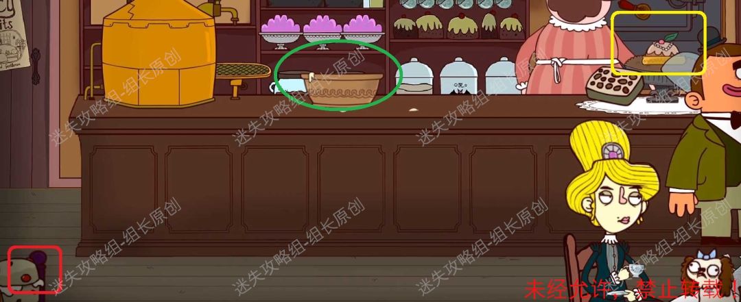 10、首先跑到暗巷,得到尸体所在地的花束。然后去下图红圈处的裁缝店得到画面最左侧的权杖,再到蛋糕店中,得到左下角的沼泽风蛋糕。10、1