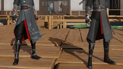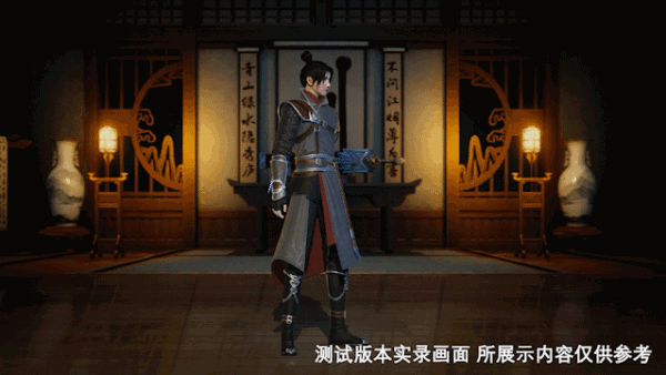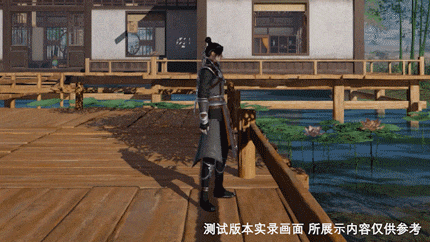 从上图我们可以很清晰地看到,新模型的裙摆动效更加真实自然,仿佛能让人感受到剑庐前的气流涌动。当然,这不仅仅是动态骨骼系统的功劳,游戏中的风场系统能够模拟现实世界中的自然微风拂动,配合动态骨骼带来更自然的动态视觉效果,让小师弟在待机状态下裙摆也可以自然的随风摆动,相较首测模型配备的待机动画中简单的呼吸摆动,“真实感”有了明显的提升。