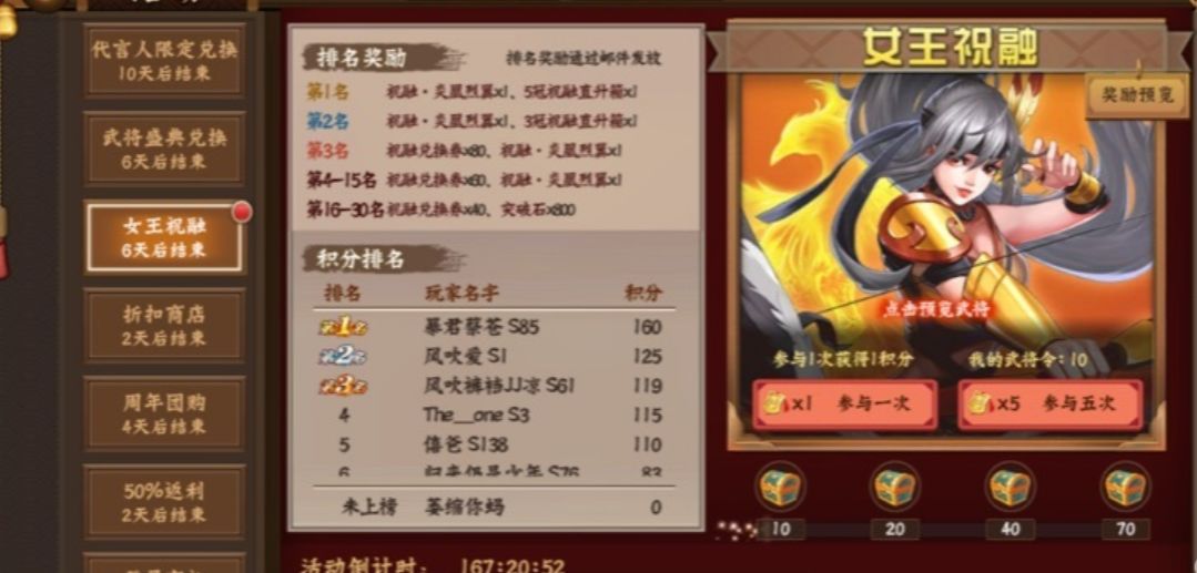 祝融:孟获之妻,火神祝融氏后裔,拥有控火御鹰神通,习得秘传箭术,可于熊熊烈焰中射出万重箭雨,重创敌军,命魂俱灭!