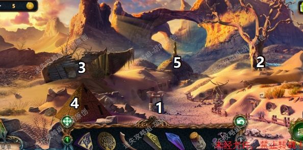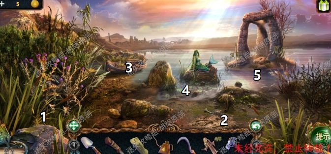 11.图中1处使用镰刀,获得第五块和尚雕塑;2处获得钥匙,再用铲子挖开土,得获得音乐盒鼓12.点击图中3小船,1处获得获得龙塑像,2处获得钥匙,4处完成拼图获得剪刀,对5使用剪刀获得天使雕塑 12 12.1