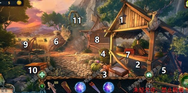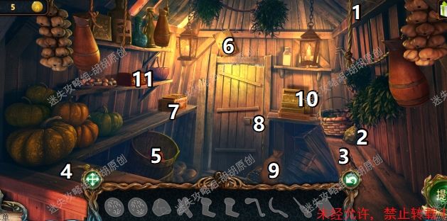 18.农具间内,图中1获得能量球;2处获得大叉,对6处使用大叉获得第六块和尚雕塑;3处点击阅读得到线索哈芬斯,4处得到捕虫网,5处得到第七块和尚雕塑,19.7处音乐盒点击手柄,打开音乐盒放入音乐盒鼓,但是鼓盒上有沙子,音乐盒暂时启动不了