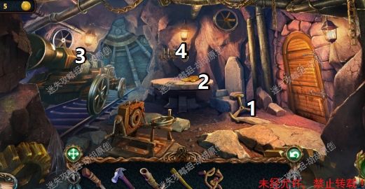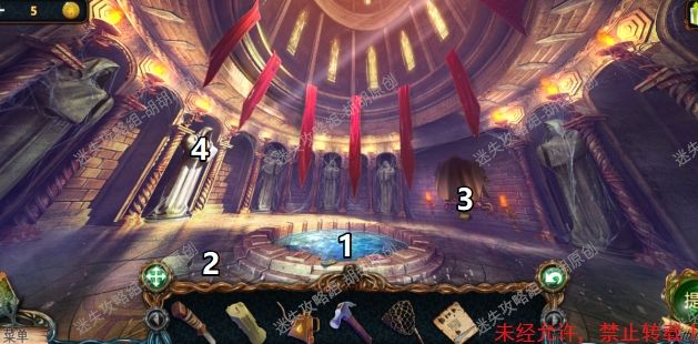 22.塔楼一层,图中1处获得火柴盒;2处破掉的地面上使用刀子获得马赛克碎片;3处获得线索黑暗镜子,并对布使用刀子获得流苏;4处使用蜡烛和火柴盒,发现并获得紫精 22