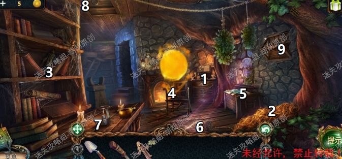 25.小屋内,对图中7处使用水门户激活(刚塔楼前树根获得的配方),将浮萍放入臼里,用旁边的舂子捣碎,完成后点击将臼放在酒精灯上,倒入紫精,得到飞粉