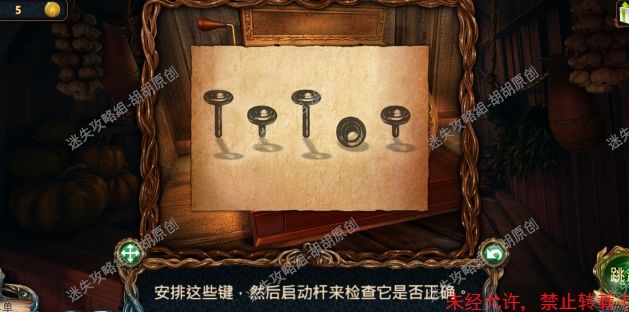 29.1处得到锥子,2处得到石头,对3使用锥子得到钥匙,4处得到按钮,5处移开苹果得到硬币,6处得到字条,对7处使用钥匙获得手柄,8处使用打开房门,捡起地上的镰刀30.对9处使用镰刀获得按钮,将两个按钮,一个手柄对10处使用,点击物品栏的字条,按照提示(如下图)调整按钮方向,然后启动手柄获得硬币 30