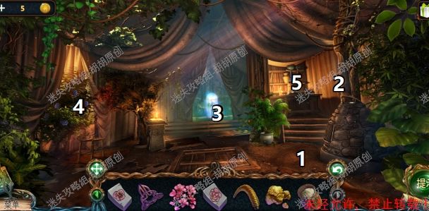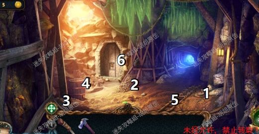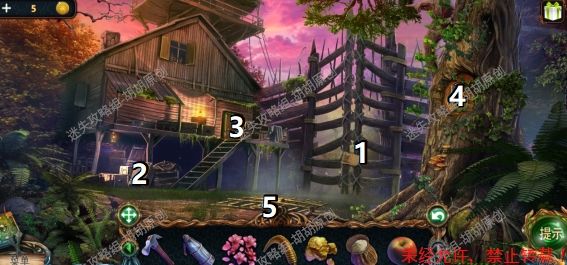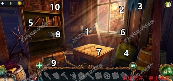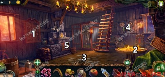 104.木屋阁楼内,1处获得闭锁机构齿轮,2处获得发光水药水配方,3处点击获得小瓶,4处获得圆刷子,5处使用圆刷子,点击6进入 104 104.1