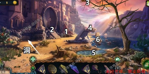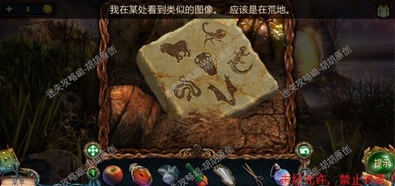 105.1处获得清洁剂,2处获得玻璃碎片,3处获得锤子,4处使用玻璃碎片获得蝎子塑像,1处放入蝎子塑像获得半浮雕,5处获得小铲子对6处使用,同时使用清洁剂获得齿轮106.7处使用锤子获得扳手,8处使用扳手获得大齿轮,9处使用所有齿轮获得半浮雕,10处使用半浮雕得到灯