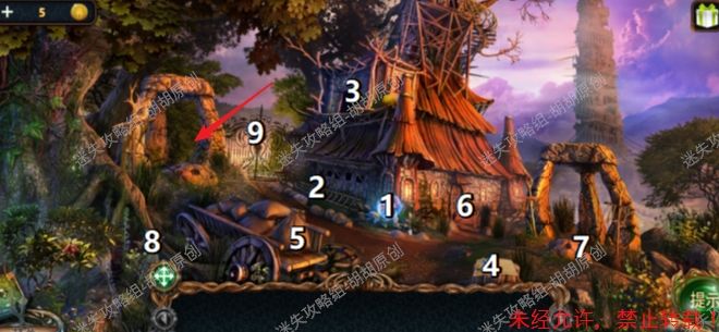 63.1处获得底座部分,2处获得底座部分,3处获得手掌,4处获得底座部分,5处将手掌放入再点击手掌获得钥匙,6处获得杆子,7处获得丁子稿,8处使用丁子稿得到晶体,9处使用三个底座部分,10处使用杆子,9处打开获得把手64.11处移开木板用钥匙打开锁,获得锤头