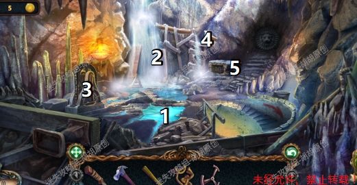 82.冻山—瀑布,4处安上木沟,装好后水流到5上,点击5开始小游戏,2314的顺序按数字,每个按到底为止,水将木塞送上洞里完成游戏,寺庙大门打开,点击开启剧情