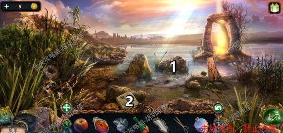 129.岸边,点击任意处开启剧情(不要被突如其来的脸吓到),1处点击锁链从湖里拉来宝箱,安上宝石获得调整表,点击船,左侧获得剪刀,右侧获得日志 129