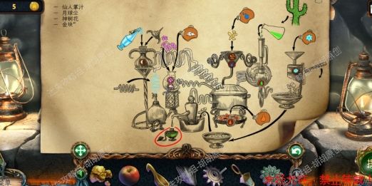 126.平原—小屋内,壁炉上方试验台中继续完成发光药水的配置,(游戏界面可以上下移动看整个界面,天堂花和金块在物品栏里,左下方记得盖上瓶盖,右侧碎冰机的手柄点击可获得碎冰,加入黄框中,一定要按图纸的提示来,最后盖上盖子获得药水)126 126.1