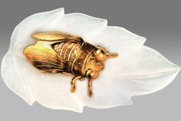 一片洁白无瑕的玉叶上,栩栩如生的金蝉悠闲驻足,金蝉含金量达95%,玉叶系用新疆和田羊脂白玉精工琢磨而成,晶莹润泽、温柔细腻。
