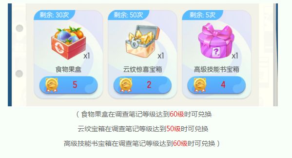 打开后必得太阳橘*1、寒晶桃*1,有机会额外再获得1-50个太阳橘或寒晶桃(可兑换30次),可使用5个调查笔记奖章兑换
