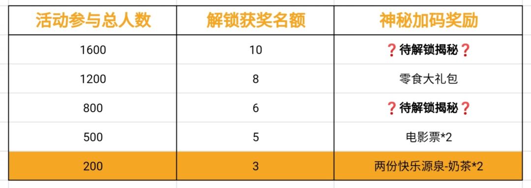 活动参与总人数达到特定量级,即可解锁“对应奖励和获奖名额”,当活动参与总人数突破500人时,奖励和获奖名额也将会提升至下一档! ~大家也看到啦,第四档的奖励将会升级为"电影票2张,5个获奖名额"!