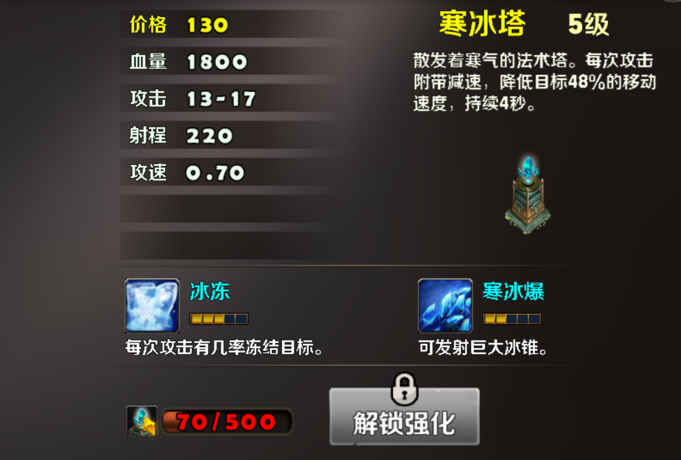 冰塔:每次攻击附带减速,降低目标移动速度,持续4秒