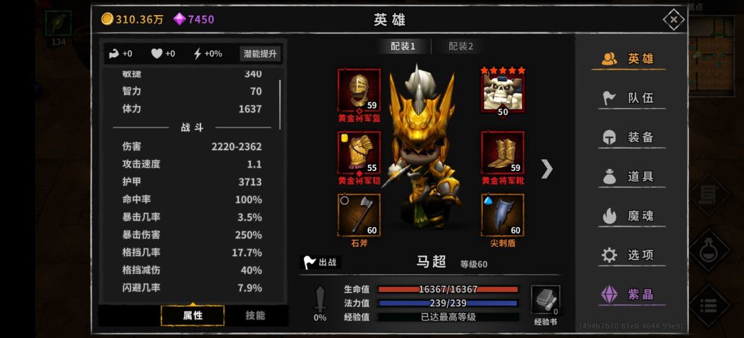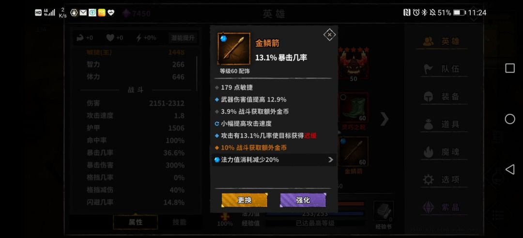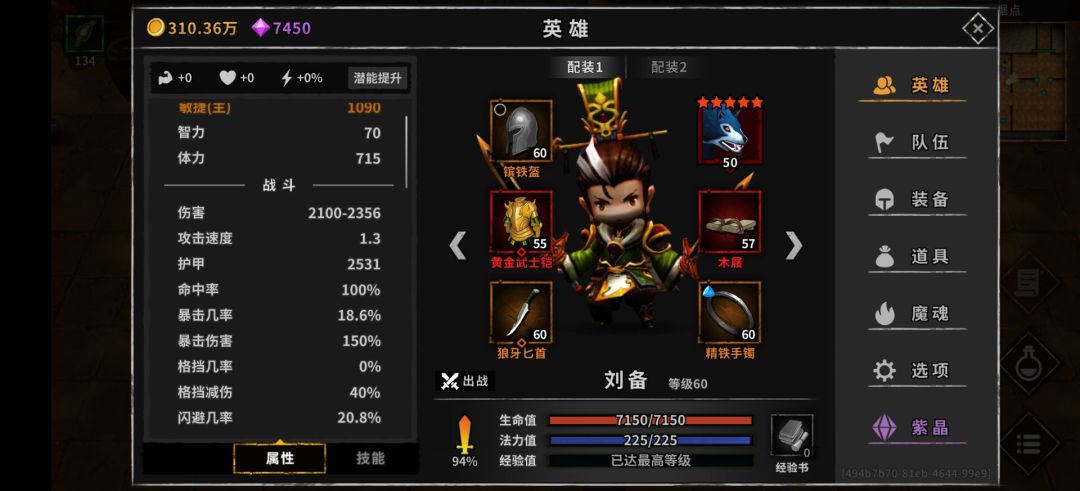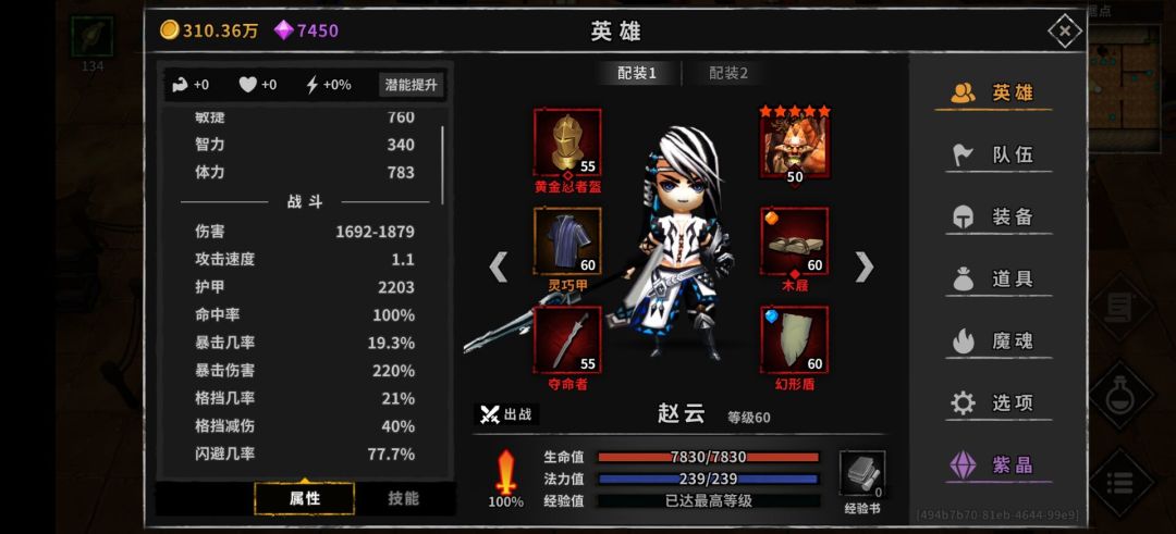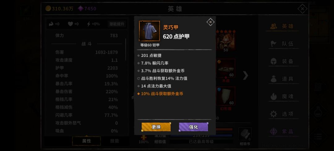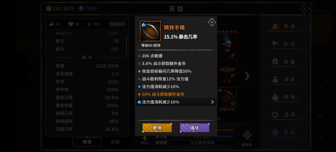 装备词条:闪避,金币,胜利回蓝,减耗。闪避金币必备,胜利回蓝减耗尽量堆,副手盾带孔打蓝宝石减少蓝量压力。