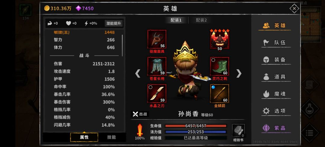 技能:满134,技能石点出攻速、普攻伤害和天晶相关的词条。