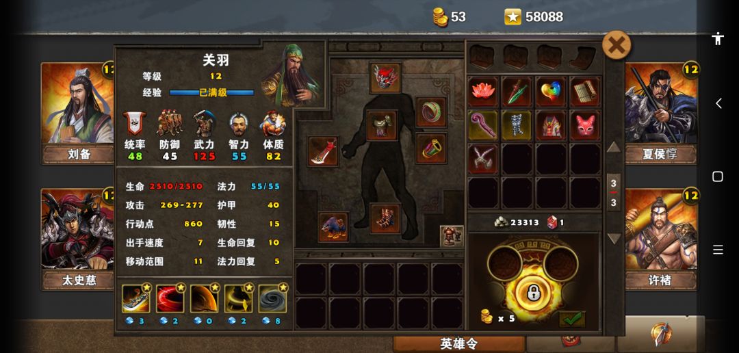 美人计虽然在上一年被改了一次,加了许多障碍物,让没有高移动坐骑的玩家玩不了刘备关羽,所以现在想用关羽刷这个密保最好12移动起步,如果有个绝影那就更好。像我这种没有绝影的就用双移动的黑熊刘备穿个玲珑鞋,骑个老鼠看脸给额外的2点移动。