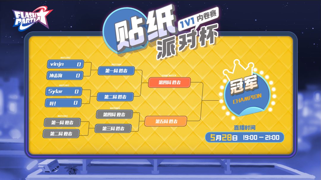 本次内部决赛的冠亚季军将会在6月6日的“贴纸派对杯决赛之夜”中以表演赛的形式乱入,与正式决赛的冠亚季军以及两位神秘嘉宾分别进行一场Flash Party史上最强切磋,就让我们搬好小板凳拭目以待吧~