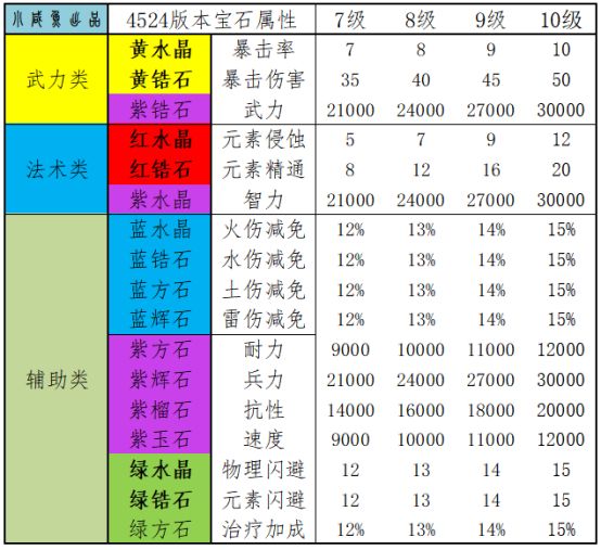 ②法术类宝石在4524谋略天下版本到来后,迎来了大的爆发,元素侵蚀和元素精通,大体上对应物理类的暴击暴伤而又另有特点,在诸多神豪大佬的不断推算下,通过红宝石强化后的法系装备,配合法师团队的强大输出及控制,将有可能打出比传统物理系神将更加高效足量的伤害输出,尤其是5.28迎来了万众瞩目的法系扛把子-吕子明,无敌技能+恐怖专属,再配上高富帅冰套,三国尽在手中啊~,目前版本法系高输出需要2名以上法师上阵,推荐武将:吕子明、周瑜、庞统、南华老仙、郭嘉,具体阵容请关注坛内各大佬攻略贴。