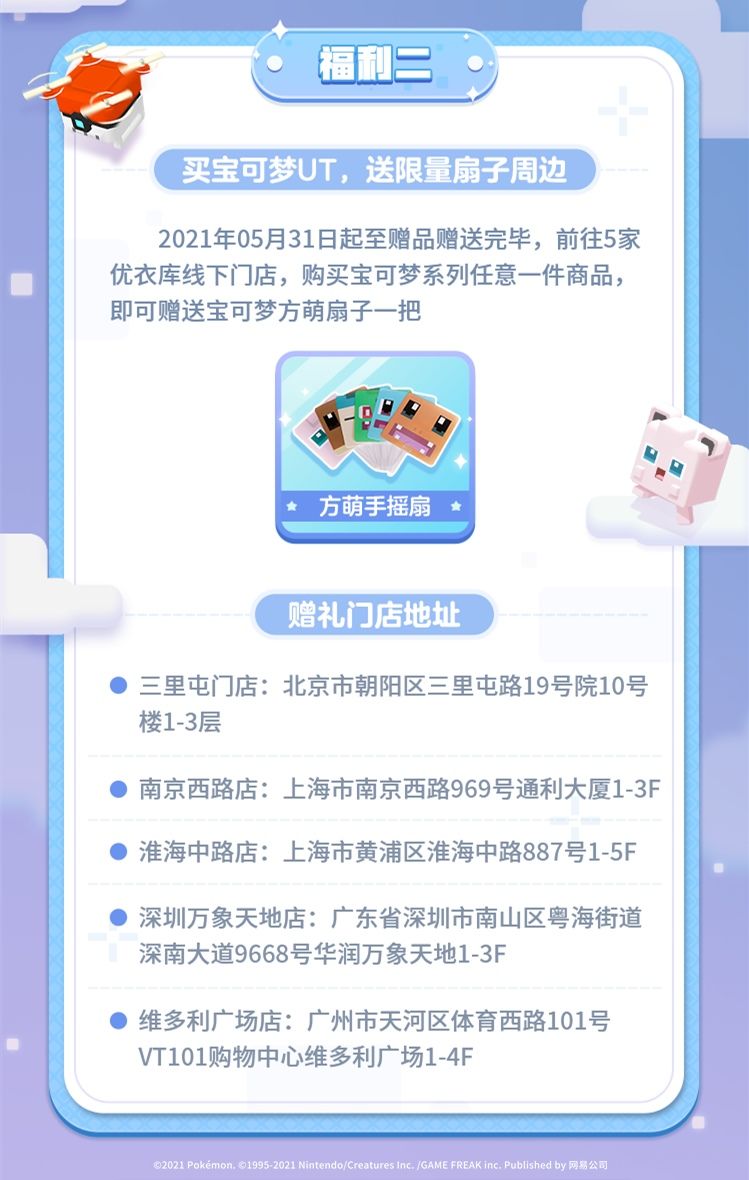 逐渐攀升的气温宣告着盛夏的临近,《宝可梦大探险》也贴心地为探险家们准备了消暑利器——5月31日起,探险家们前往北上广深四地的5家指定优衣库门店,购买任意一件宝可梦系列商品,即可获赠《宝可梦大探险》方萌扇子一把,为你驱散炎热,送去清凉。