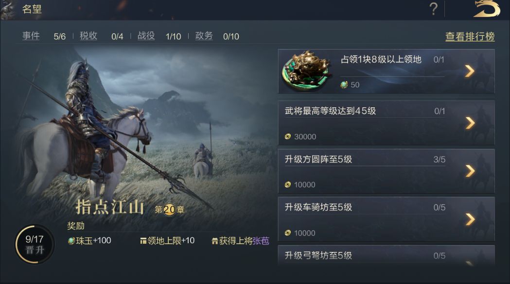 名望任务相当于新手教程,刚接触鸿图之下的小伙伴可根据名望任务陆续完成。名望任务的奖励包括珠玉、资源、铜币、提升领地上限,都是前期开荒必不可少的。除了快速提名望,前期最重要的是就是占地。
