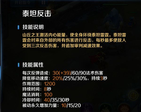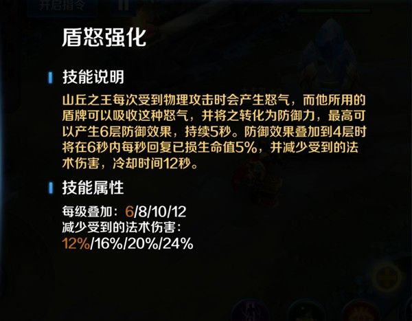 山丘之王的被动技能大幅度提升了他的防御能力,法术伤害减免可以很好的针对法师,让山丘之王自带双属性防御效果。而且被动叠加到4层之后会回血,提升了英雄的赖线和续航能力。