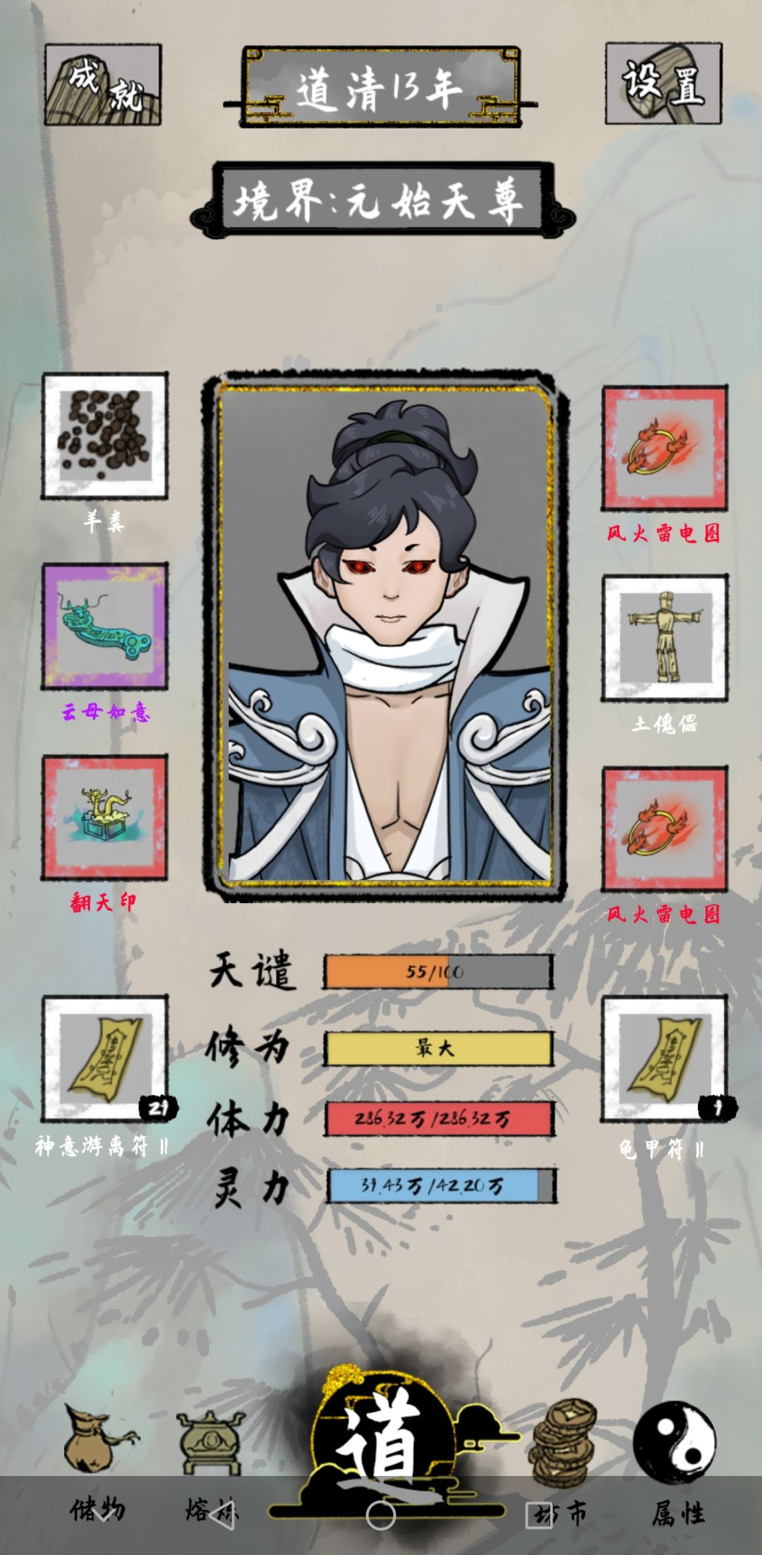 其实就是开局的基础属性,普通模式下要通关,满足三个条件,一是寿命,二是属性过关,三是一丢丢的运气,当然非洲人可能一个寿星解决不了。剩下的就很简单了,寿命方面我们通过寿星(龟虽寿)去解决,属性方面有就拿,没有不强求,重点在哪呢,重点就是初始属性,这很重要,攻在25以上,防要比攻高,防比攻高就可以无脑撞心魔,boss根据流派去选择打法。可玩性非常高,比起专门刷天赋去玩,这个就是随便点两下就可以。