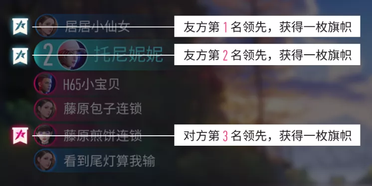 组队赛:每支队伍的1、2、3名分别与对方队伍的1、2、3名进行比较,同名次领先的一方获得一枚旗帜。比赛结束时,一方获得至少两枚旗帜即可获胜。