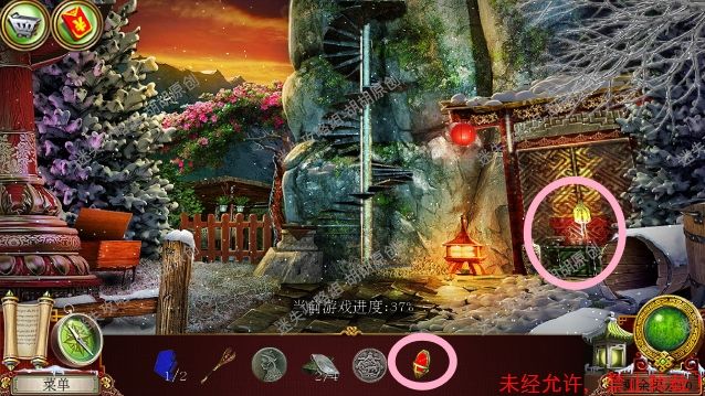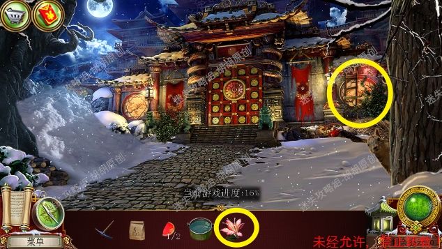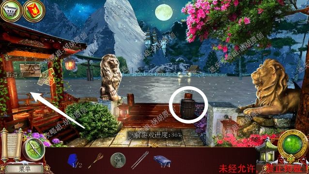 34.右边门处获得锄头,左边台阶往前走,进入喷泉35.喷泉,1处按照下图给坛子盖好盖子,获得神社钥匙;2处获得金属片②;3处使用镐获得放大镜和保险箱钥匙,接着返回(这里返回要注意可能要点很多次才能回冻土隧道) 35.1.2