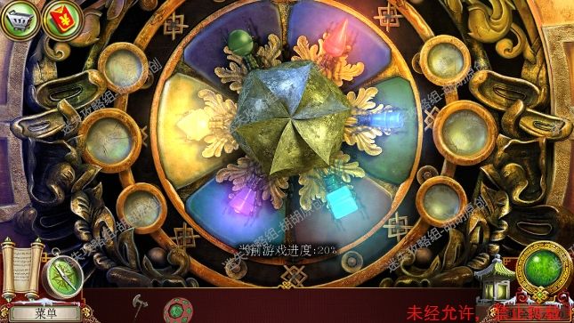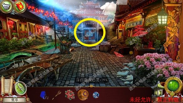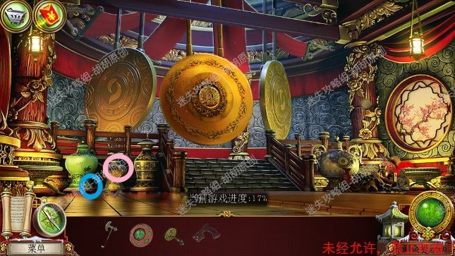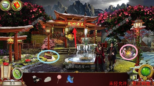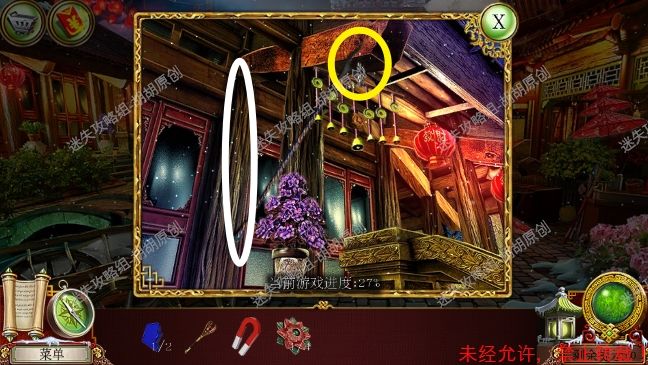 59.传送门,左侧菩萨红框处完成寻物游戏,获得宝石①;地上盘子黄框处获得阴阳阳部分;蓝框推车处获得贝壳;粉框处使用贝壳获得阴阳阴部分,接着找到渔网;对水池使用渔网获得宝石②;最后右边门处使用宝石和阴阳部分,按照下图完成小游戏,进入会场 59.1.2.3.4.5.6.7