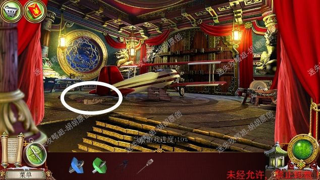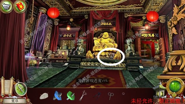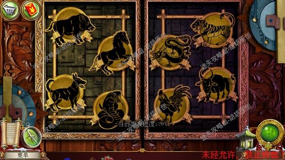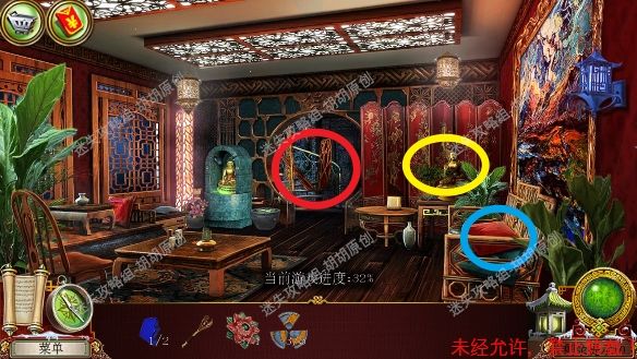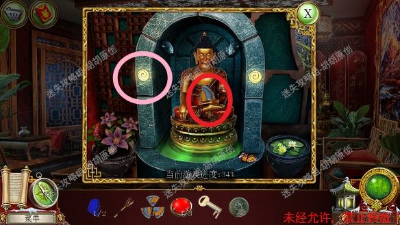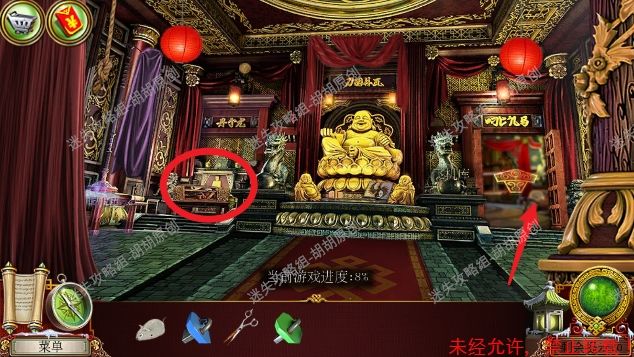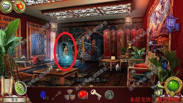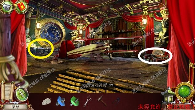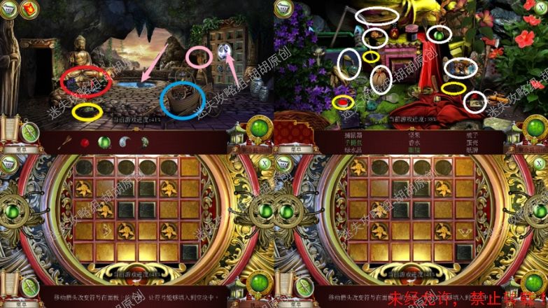 8.高原—大厅,左侧红框处放上熊猫,中间开关启动,进入寻物游戏,按照下图完成游戏(有些物品会一闪一闪的,一定要注意),完成后获得钝剪刀,中间佛脚下获得绿色手柄和笔记。右边,顺着红箭头去往飞机房 8.1.2