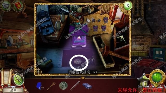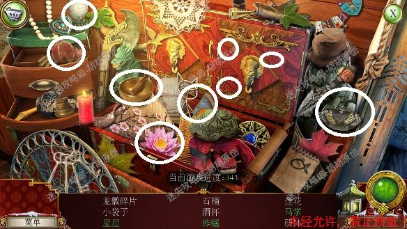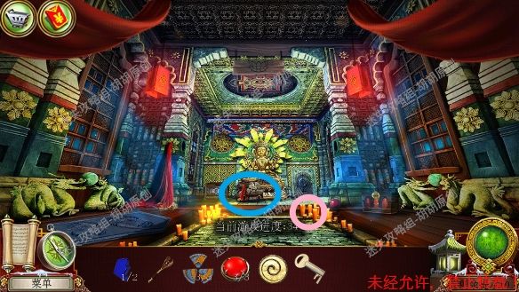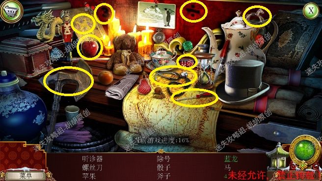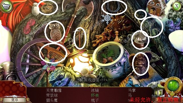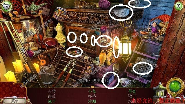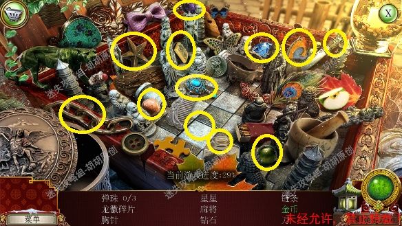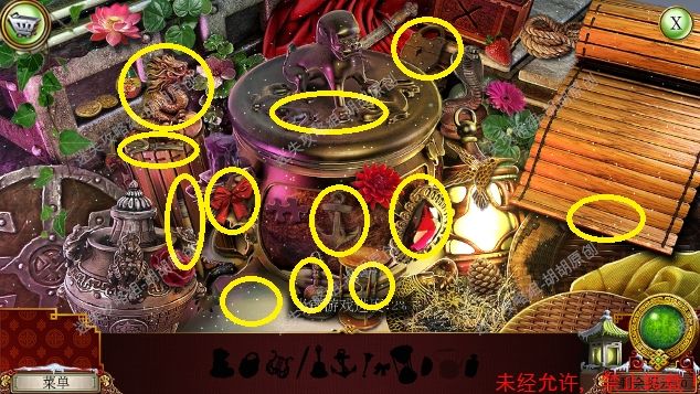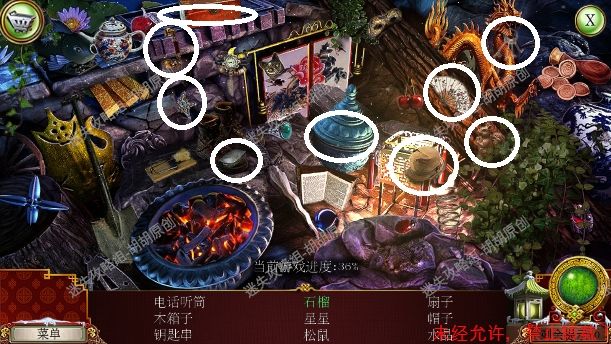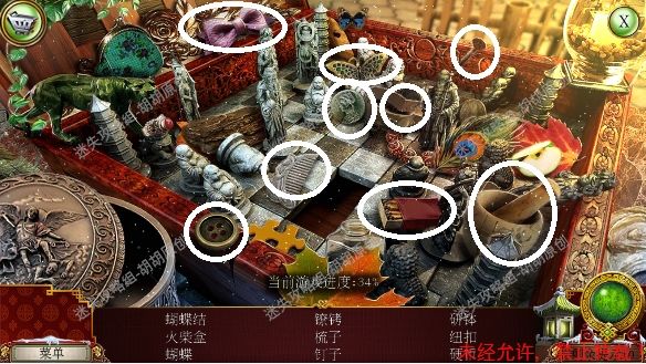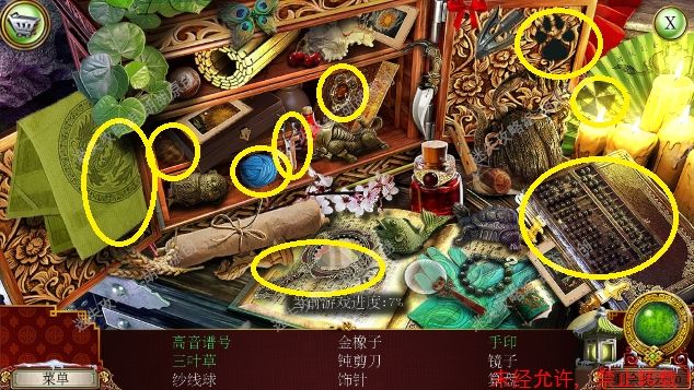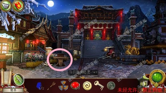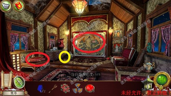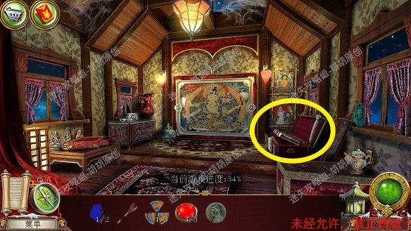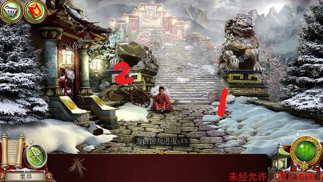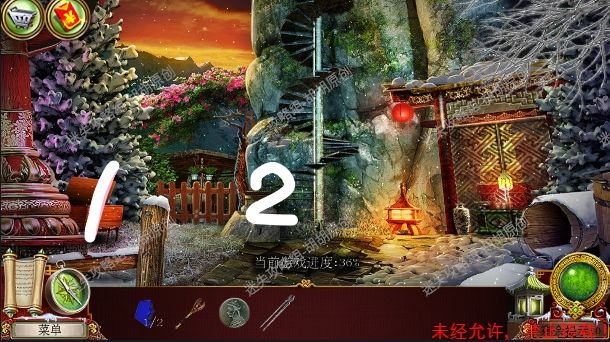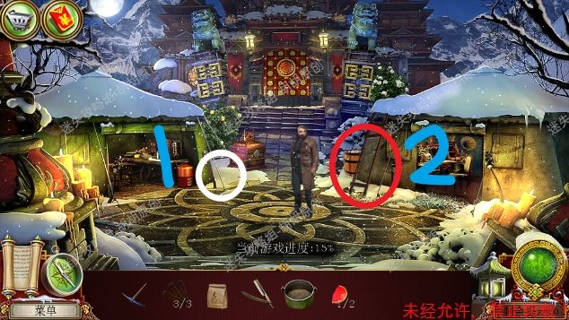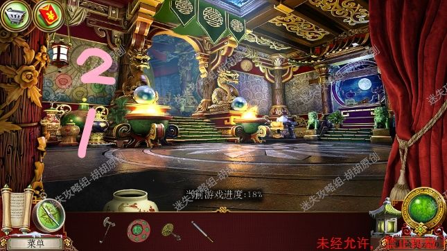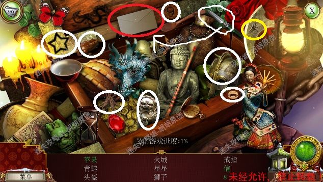 2.宫殿前,1处台阶的包里获得信件和一把钥匙;2处用钥匙打开行李箱,进入寻物游戏(黄框处注意等变到苹果图形再点,所有东西找齐后用小刀将信件打开),完成后获得火绒 2.1.2